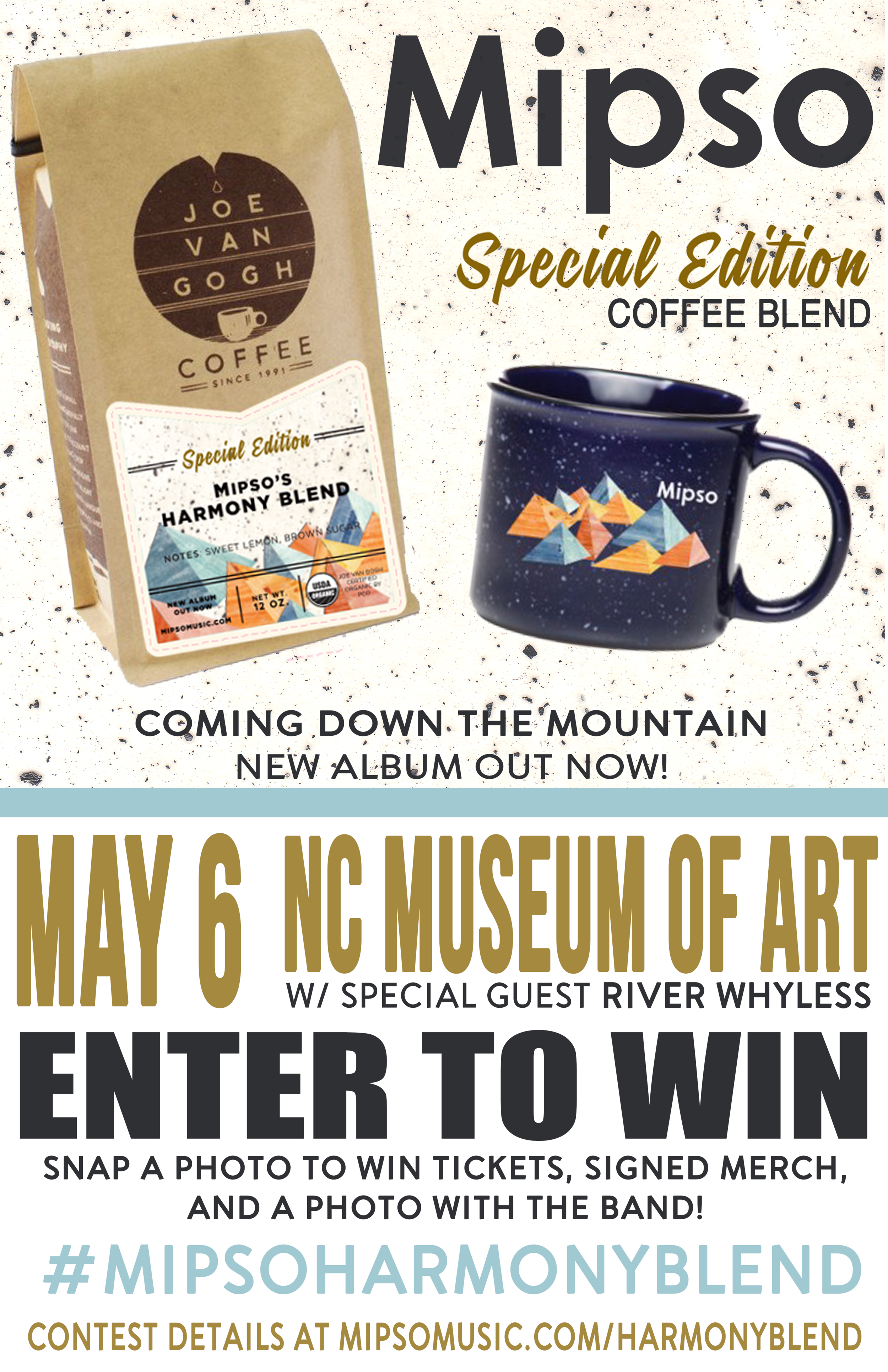 Our dream of Mipso coffee has finally come true! We’re so pleased to announce our collaboration with Joe Van Gogh! Mipso’s Harmony Blend is now available at all locations in the Triangle. Pick up a bag or drink, post a photo using the hashtag #MipsoHarmonyBlend, and you’ll be entered to win 2 Tickets to our North Carolina Museum of Art debut on May 6th, signed CDs & more.
